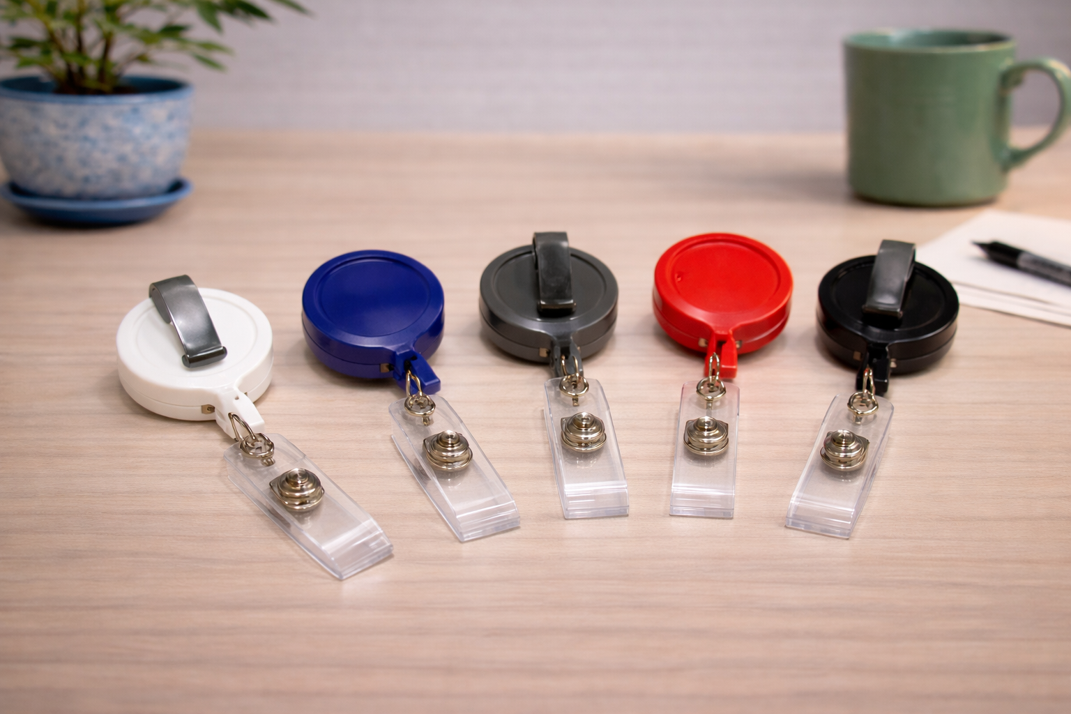 The retractable option reals out 3 feet of retractable nylon cord. Includes durable clear strap for securing ID badge. Great anywhere that requires quick and frequent access to ID badges. Pack in of 100 per box. Choose from nine colors Black, White, Gray, Red, Clear, Blue Tinted, Smoke Tinted, Red Tinted, Silver.